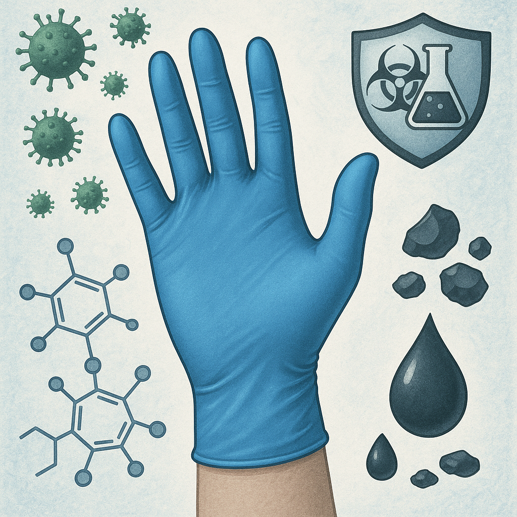 Нитриловые перчатки создаются из высокотехнологичного синтетического каучука (NBR). Этот материал обладает высокой устойчивостью к механическим нагрузкам, действию масел, смазок, химических реагентов, растворителей и биологических жидкостей. За счет плотной структуры нитрил обеспечивает: